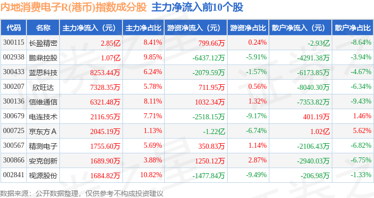 资金流向方面,内地消费电子R(港币)(483106)指数成份股当日主力资金净流出合计10.78亿元,游资资金净流出合计1367.11万元,散户资金净流入合计10.91亿元。成份股资金流向详情见下表: