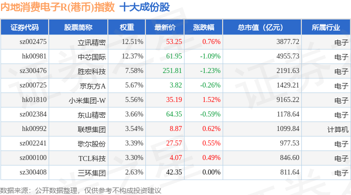 内地消费电子R(港币)(483106)指数十大成份股详情如下: