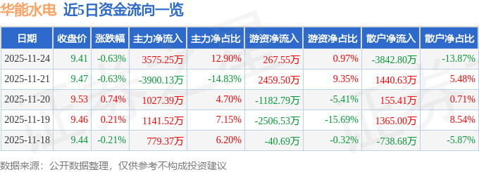 证券之星消息,截至2025年11月24日收盘,华能水电(600025)报收于9.41元,下跌0.63%,换手率0.16%,成交量29.5万手,成交额2.77亿元。