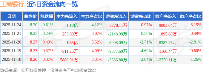 证券之星消息,截至2025年11月24日收盘,工商银行(601398)报收于8.2元,下跌0.61%,换手率0.13%,成交量348.92万手,成交额28.6亿元。