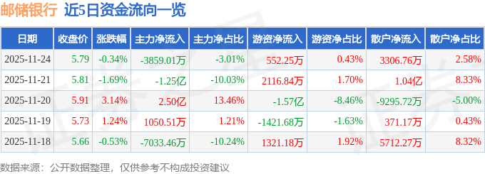 证券之星消息,截至2025年11月24日收盘,邮储银行(601658)报收于5.79元,下跌0.34%,换手率0.33%,成交量219.42万手,成交额12.84亿元。