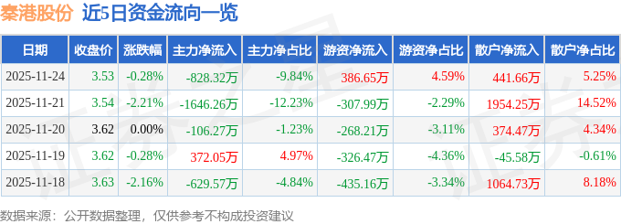 证券之星消息,截至2025年11月24日收盘,秦港股份(601326)报收于3.53元,下跌0.28%,换手率0.5%,成交量23.74万手,成交额8418.38万元。