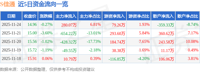 证券之星消息,截至2025年11月24日收盘,S佳通(600182)报收于14.96元,下跌0.27%,换手率1.62%,成交量2.75万手,成交额4111.83万元。