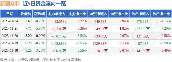 证券之星消息,截至2025年11月24日收盘,新疆众和(600888)报收于7.69元,下跌0.26%,换手率1.51%,成交量21.19万手,成交额1.63亿元。