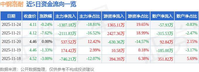 证券之星消息,截至2025年11月24日收盘,中钢洛耐(688119)报收于4.11元,下跌0.24%,换手率1.5%,成交量16.89万手,成交额6948.28万元。