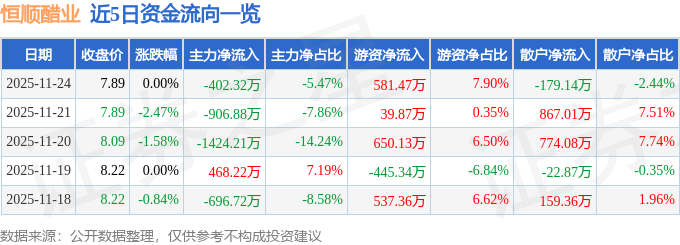 11月24日的资金流向数据方面,主力资金净流出402.32万元,占总成交额5.47%,游资资金净流入581.47万元,占总成交额7.9%,散户资金净流出179.14万元,占总成交额2.44%。