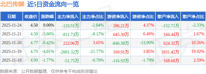 证券之星消息,截至2025年11月24日收盘,北巴传媒(600386)报收于4.5元,上涨0.0%,换手率1.8%,成交量14.52万手,成交额6552.52万元。