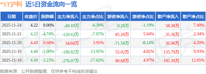 证券之星消息,截至2025年11月24日收盘,*ST沪科(600608)报收于4.22元,上涨0.0%,换手率0.58%,成交量1.85万手,成交额779.59万元。