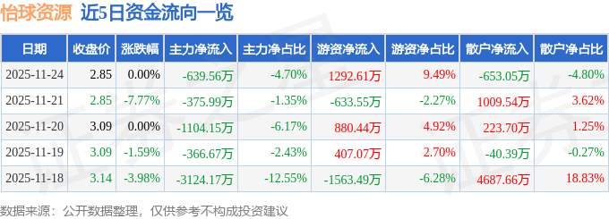 证券之星消息,截至2025年11月24日收盘,怡球资源(601388)报收于2.85元,上涨0.0%,换手率2.17%,成交量47.78万手,成交额1.36亿元。