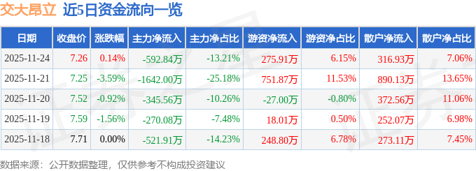 证券之星消息,截至2025年11月24日收盘,交大昂立(600530)报收于7.26元,上涨0.14%,换手率0.8%,成交量6.21万手,成交额4488.91万元。