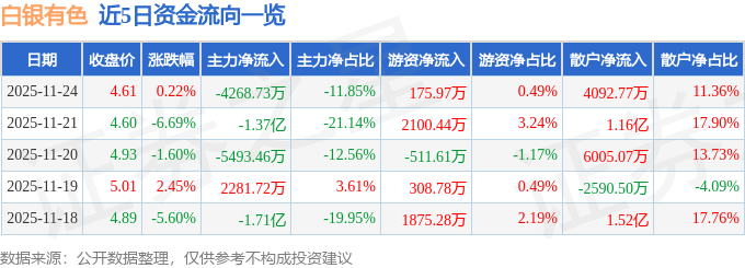 证券之星消息,截至2025年11月24日收盘,白银有色(601212)报收于4.61元,上涨0.22%,换手率1.05%,成交量77.95万手,成交额3.6亿元。