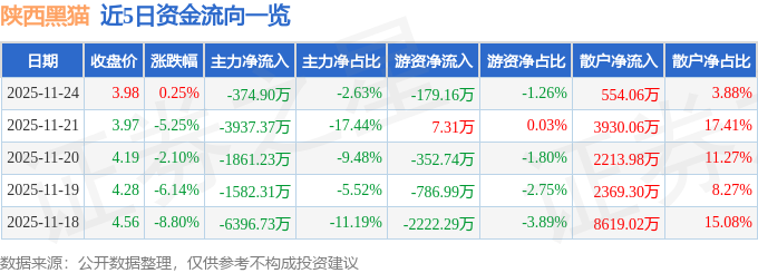 证券之星消息,截至2025年11月24日收盘,陕西黑猫(601015)报收于3.98元,上涨0.25%,换手率1.75%,成交量35.79万手,成交额1.43亿元。