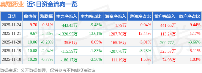 证券之星消息,截至2025年11月24日收盘,奥翔药业(603229)报收于9.7元,上涨0.31%,换手率0.58%,成交量4.81万手,成交额4679.49万元。
