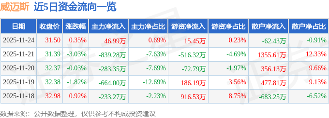 证券之星消息,截至2025年11月24日收盘,威迈斯(688612)报收于31.5元,上涨0.35%,换手率0.86%,成交量2.17万手,成交额6844.47万元。