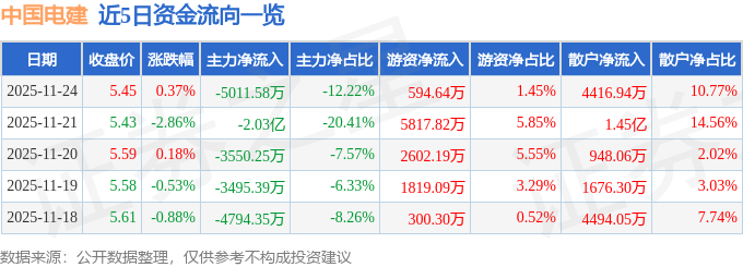 证券之星消息,截至2025年11月24日收盘,中国电建(601669)报收于5.45元,上涨0.37%,换手率0.58%,成交量75.39万手,成交额4.1亿元。