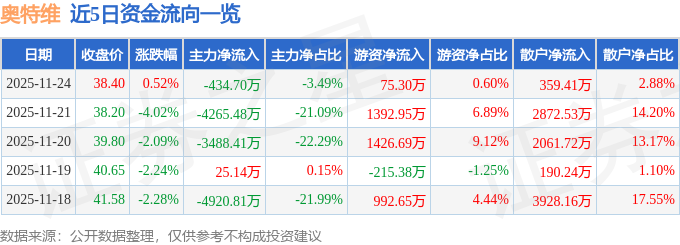 证券之星消息,截至2025年11月24日收盘,奥特维(688516)报收于38.4元,上涨0.52%,换手率1.03%,成交量3.25万手,成交额1.25亿元。