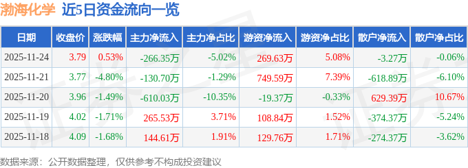 证券之星消息,截至2025年11月24日收盘,渤海化学(600800)报收于3.79元,上涨0.53%,换手率1.26%,成交量14.02万手,成交额5305.44万元。