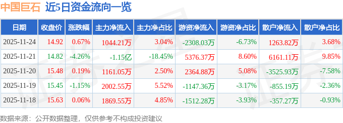 证券之星消息,截至2025年11月24日收盘,中国巨石(600176)报收于14.92元,上涨0.67%,换手率0.57%,成交量22.92万手,成交额3.43亿元。