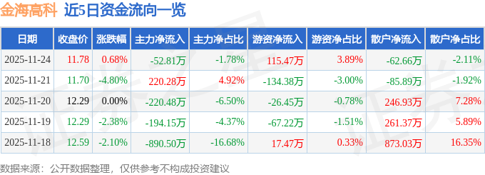 证券之星消息,截至2025年11月24日收盘,金海高科(603311)报收于11.78元,上涨0.68%,换手率1.06%,成交量2.51万手,成交额2968.13万元。
