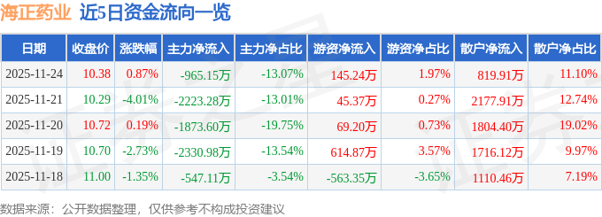 证券之星消息,截至2025年11月24日收盘,海正药业(600267)报收于10.38元,上涨0.87%,换手率0.59%,成交量7.13万手,成交额7384.31万元。