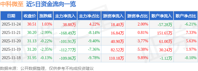 11月24日的资金流向数据方面,主力资金净流入38.88万元,占总成交额4.22%,游资资金净流入18.4万元,占总成交额2.0%,散户资金净流出57.28万元,占总成交额6.21%。
