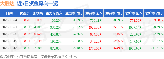 证券之星消息,截至2025年11月24日收盘,大胜达(603687)报收于8.7元,上涨1.05%,换手率1.8%,成交量9.88万手,成交额8496.49万元。