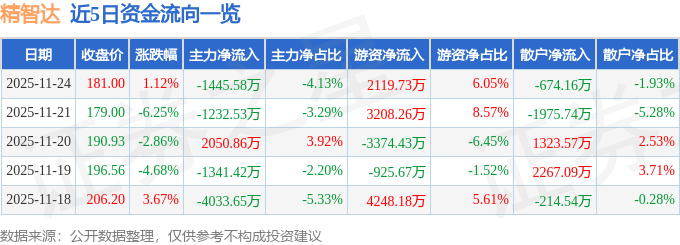 证券之星消息,截至2025年11月24日收盘,精智达(688627)报收于181.0元,上涨1.12%,换手率2.63%,成交量1.9万手,成交额3.5亿元。