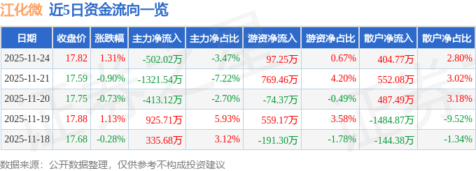 证券之星消息,截至2025年11月24日收盘,江化微(603078)报收于17.82元,上涨1.31%,换手率2.12%,成交量8.18万手,成交额1.45亿元。