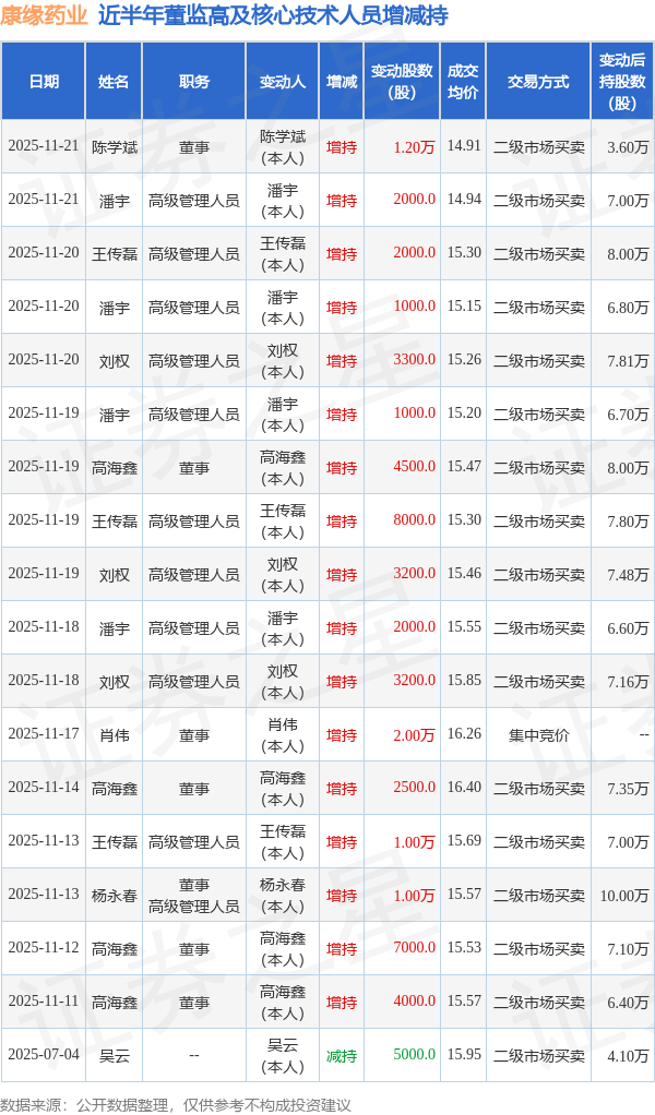 证券之星消息,根据11月24日市场公开信息、上市公司公告及交易所披露数据整理,康缘药业(600557)最新董监高及相关人员股份变动情况:2025年11月20日至2025年11月21日公司高级管理人员刘权、高级管理人员潘宇、高级管理人员王传磊、董事陈学斌共增持公司股份2.03万股,占公司总股本为0.0037%。变动期间公司股价下跌2.62%,11月21日当日收盘报14.84元。