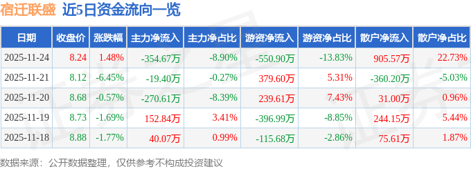 11月24日的资金流向数据方面,主力资金净流出354.67万元,占总成交额8.9%,游资资金净流出550.9万元,占总成交额13.83%,散户资金净流入905.57万元,占总成交额22.73%。