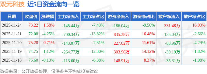 证券之星消息,截至2025年11月24日收盘,双元科技(688623)报收于73.22元,上涨1.58%,换手率1.4%,成交量2672.0手,成交额1958.42万元。
