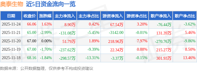 证券之星消息,截至2025年11月24日收盘,奥泰生物(688606)报收于66.06元,上涨1.63%,换手率0.4%,成交量3209.0手,成交额2109.9万元。