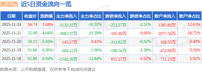 证券之星消息,截至2025年11月24日收盘,美迪西(688202)报收于56.74元,上涨1.68%,换手率1.45%,成交量1.95万手,成交额1.1亿元。