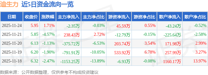 证券之星消息,截至2025年11月24日收盘,迪生力(603335)报收于5.95元,上涨1.71%,换手率3.26%,成交量13.98万手,成交额8265.55万元。