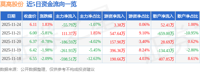 证券之星消息,截至2025年11月24日收盘,莫高股份(600543)报收于6.11元,上涨1.83%,换手率2.67%,成交量8.58万手,成交额5223.57万元。