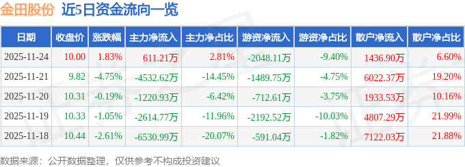 证券之星消息,截至2025年11月24日收盘,金田股份(601609)报收于10.0元,上涨1.83%,换手率1.27%,成交量21.87万手,成交额2.18亿元。