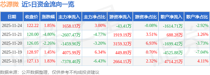 证券之星消息,截至2025年11月24日收盘,芯源微(688037)报收于122.22元,上涨1.85%,换手率2.26%,成交量4.56万手,成交额5.53亿元。