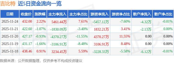 11月24日的资金流向数据方面,主力资金净流入5461.44万元,占总成交额7.61%,游资资金净流出5457.12万元,占总成交额7.6%,散户资金净流出4.32万元,占总成交额0.01%。
