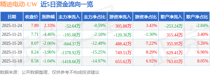 证券之星消息,截至2025年11月24日收盘,精进电动(688280)报收于7.89元,上涨2.33%,换手率2.2%,成交量11.47万手,成交额8912.33万元。