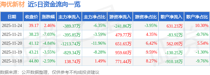 证券之星消息,截至2025年11月24日收盘,海优新材(688680)报收于39.17元,上涨2.46%,换手率1.88%,成交量1.58万手,成交额6130.25万元。