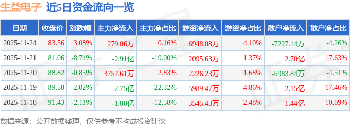证券之星消息,截至2025年11月24日收盘,生益电子(688183)报收于83.56元,上涨3.08%,换手率2.44%,成交量20.29万手,成交额16.96亿元。