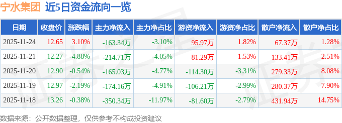 证券之星消息,截至2025年11月24日收盘,宁水集团(603700)报收于12.65元,上涨3.1%,换手率2.08%,成交量4.19万手,成交额5275.16万元。