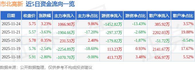 证券之星消息,截至2025年11月24日收盘,市北高新(600604)报收于5.75元,上涨3.23%,换手率1.34%,成交量18.85万手,成交额1.08亿元。