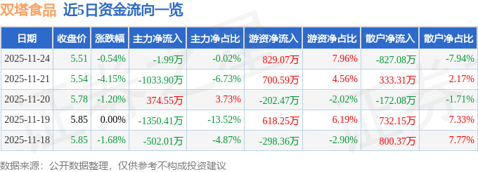 证券之星消息,截至2025年11月24日收盘,双塔食品(002481)报收于5.51元,下跌0.54%,换手率1.68%,成交量18.83万手,成交额1.04亿元。