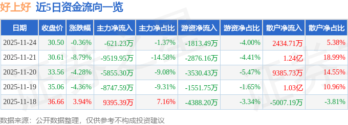 证券之星消息,截至2025年11月24日收盘,好上好(001298)报收于30.5元,下跌0.36%,换手率9.18%,成交量15.11万手,成交额4.53亿元。