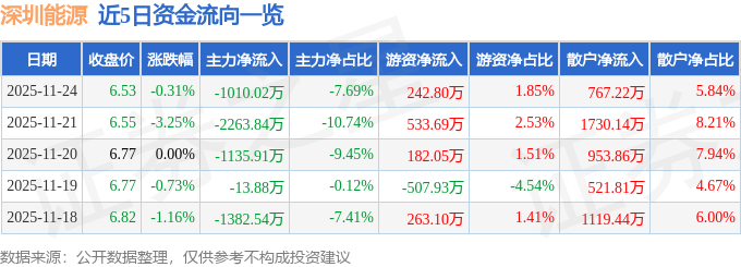 证券之星消息,截至2025年11月24日收盘,深圳能源(000027)报收于6.53元,下跌0.31%,换手率0.42%,成交量20.05万手,成交额1.31亿元。