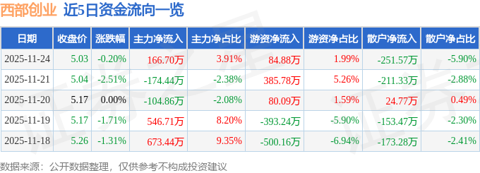 证券之星消息,截至2025年11月24日收盘,西部创业(000557)报收于5.03元,下跌0.2%,换手率0.58%,成交量8.44万手,成交额4260.56万元。
