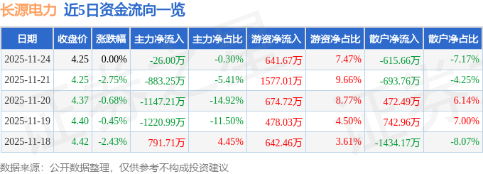 证券之星消息,截至2025年11月24日收盘,长源电力(000966)报收于4.25元,上涨0.0%,换手率0.62%,成交量20.2万手,成交额8588.22万元。