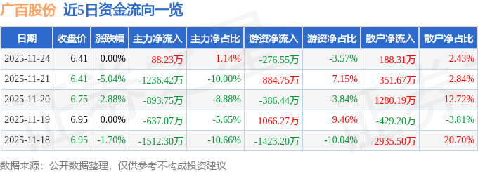 证券之星消息,截至2025年11月24日收盘,广百股份(002187)报收于6.41元,上涨0.0%,换手率1.72%,成交量12.04万手,成交额7738.25万元。