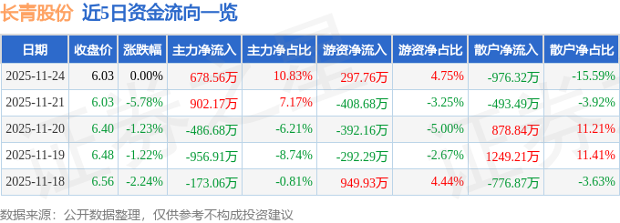 证券之星消息,截至2025年11月24日收盘,长青股份(002391)报收于6.03元,上涨0.0%,换手率2.25%,成交量10.43万手,成交额6263.89万元。